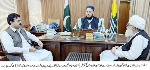 ڈیلی پرل ویو.وزیر اطلاعات آزاد حکومت ریاست جموں وکشمیر پیر محمد مظہر سعید شاہ سے چیئرمین علماء ومشائخ کونسل پاکستان ،مرکزی نائب صدر جمعیت علمائے پاکستان ، سجادہ نشین دربار عالیہ نقشبندیہ مجددیہ چورہ شریف پیر سید سعادت علی شاہ نے ملاقات کی۔ ملاقات میں مسئلہ کشمیر سمیت باہمی دلچسپی کے امور پر تبادلہ خیال کیا گیا۔ اس موقع پر گفتگو کرتے ہوئے وزیر اطلاعات پیر محمد مظہر سعید شاہ نے کہا کہ تحریک پاکستان اور پاکستان میں امن و امان کو برقرار رکھنے میں علمائے کرام کا کلیدی کردار ہے۔ پاکستان کی خاطر سب کو ایک ہو کر آگے بڑھنا ہے، پاکستان اللہ تعالیٰ کی ایک عظیم نعمت ہے۔ پاکستان مسلم امہ میں خصوصی اہمیت کا حامل ہے۔ خطے میں امن واستحکام کیے لئے پاکستان کا کردار قابل فخر ہے۔ انہوں نےکہا کہ سنت ِرسول اللہﷺ پر عمل ہی امت مسلمہ کو راہ راست پر عمل پیرا رکھ سکتا ہے۔ اسلام میں کسی لسانی اور علاقائی گروہ بندی کی کوئی گنجائش موجود نہیں۔ اس موقع پر گفتگو کرتے ہوئے چیئرمین علمائے و مشائخ کونسل پیر سید سعادت علی شاہ نے کہا کہ ہندوستان مقبوضہ جموں وکشمیر میں ظلم و جبر کے پہاڑ توڑ رہا ہے، پاکستان نے ہمیشہ اپنے کشمیری بھائیوں کی سیاسی سفارتی اور اخلاقی حمایت کی ہے، مسئلہ کشمیر کا کشمیری عوام کی خواہشات کے مطابق حل ہی خطے میں امن کی ضمانت ہے۔ انہوں نے کہا کہ کشمیر اولیا کی دھرتی ہے، کشمیری عوام کو ہندوستان کے بدترین جبر کے سامنے ڈٹے رہنے پر سلام پیش کرتے ہیں۔ انہوں نے کہا کہ وزیر اطلاعات پیر محمد مظہر سعید شاہ کی خصوصی دعوت پر کشمیر آیا ہوں۔ کشمیر کی مٹی بڑی زرخیز ہے یہاں بڑے نامور لوگ پیدا ہوئے جنہوں نے بین الاقوامی سطح پر ملک و قوم کا نام روشن کیا ہے۔قبل ازیں وزیر اطلاعات نے اپنے آفس چیمبر آمد پر چیئرمین علمائے و مشائخ کونسل پاکستان کو ویلکم کیا اور انکا خصوصی شکریہ ادا کیا۔ چیئرمین علمائے و مشائخ کونسل پیر سید سعادت علی شاہ نے وزیر اطلاعات پیر محمد مظہر سعید شاہ کو درگاہ جورہ شریف میں ہونے والی سالانہ ختم نبوت کانفرنس میں شرکت کی دعوت بھی دی۔ وزیر اطلاعات نے چیئرمین علماء ومشائخ کونسل کونسل کو شیلڈ بھی پیش کی۔