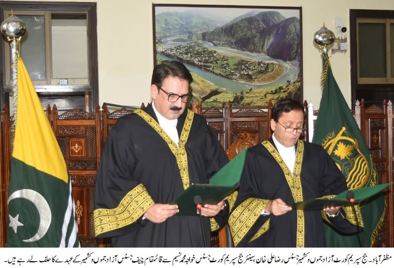 ڈیلی پرل ویو. سینئر حج سپریم کورٹ جسٹس خواجہ محمد نسیم نے قائم مقام چیف جسٹس سپریم کورٹ آزادجموں وکشمیر کا حلف اٹھالیا۔ حج سپریم کورٹ جسٹس رضا علی خان نے ان سے حلف لیا۔ حلف برداری کی تقریب سپریم کورٹ آزاد جموں و کشمیر کی لابی میں منعقد ہوئی جس میں چیف جسٹس ہائی کورٹ جسٹس سردار لیاقت حسین، جج ہائی کورٹ جسٹس سید شاہد بہار، سابق چیف جسٹس عدالت عالیہ جسٹس صداقت حسین راجہ ، کسٹوڈین متروکہ املاک، سپریم کورٹ ہائی کورٹ بار کے سیکرٹری جنرل اور عہدیداران، بار کونسل کے عہدیداران، صدر و عہدیداران سنٹرل بار مظفر آباد، چئیر مین اپیلیٹ ٹربیونل ان لینڈ ریونیو، چئیر مین ماحولیاتی ٹربیونل، ممبر سروس ٹربیونل، حج الیکشن ٹربیونل، ڈسٹرکٹ حج مظفر آباد، ضلع قاضی مظفر آباد، ممبر لا کمیشن، لا آفیسران، بار کونسل کے موجودہ اور سابق عہدیداران و اراکین، سیکرٹری قانون، رجسٹرار سپریم کورٹ کے علاوہ سینئر وکلاء کی کثیر تعداد نے شرکت کی۔ تقریب کا باقاعدہ آغاز تلاوت کلام پاک اور نعت رسول مقبول صلی اللہ علیہ وآلہ وسلم سے ہوا۔ سیکر ٹری قانون انصاف و پارلیمانی امور نے قائم مقام چیف جسٹس کی تقرری کا نوٹیفکیشن پڑھ کر سنایا۔ جسٹس راجہ سعید اکرم خان نجی دورہ پر بیرون ملک روانہ ہوچکے ہیں اور ان کی ایکس پاکستان لیو کے دوران جسٹس خواجہ محمد نسیم بطور قائم مقام چیف جسٹس آزاد جموں و کشمیر آئینی فرائض سر انجام دیں گے۔