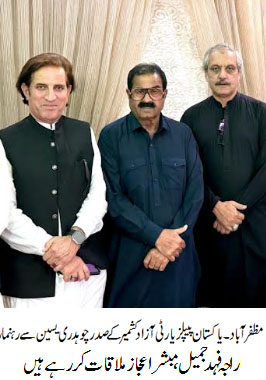 ڈیلی پرل ویو.پاکستان پیپلز پارٹی آزاد کشمیر کے صدر چوہدری یسین سے رہنما راجہ فہد جمیل کی اہم ملاقات آزاد کشمیر میں آنے والا دور حکومت پاکستان پیپلز پارٹی کا ہو گا راجہ فہد جمیل آزاد کشمیر میں پیپلز پارٹی کی حکومت جلد قائم ہوگی جس کے چئیرمین بلاول بھٹو زداری نے مسلہ کشمیر کو پوری دنیا میں اجاگر کر کے شہید رانی بے نظیر بھٹو کے مشن کو آگے بڑھار آزاد کشمیر کے عوام کے مسائل ان کی دہلیز پر حل ہوں گے انہوں نے کہا کہ ازاد کشمیر میں تحریک انصاف اور مسلم لیگ نون عوامی مسائل حل کرنے میں ناکام ہو چکی ہیں مسلم لیگ نون ازاد کشمیر میں مردہ گھوڑے کی مانند ہے وہ اپ بیساکھیوں کا سہارا ڈھونڈ رہی ہے انہوں نے وہ مسئلہ کشمیر کے حل کے لیے اپنا کردار ادا کرے۔صدر پاکستان آصف علی زرداری مسلہ کشمیر کو اجاگر کرنے میں ذوالفقار علی بھٹو شہید کے مشن کو جاری رکھیں گے اور کشمیری قوم کی آواز بننے گے،اتحادی حکومت صرف پی پی کی وجہ سے چل رہی ہیں موجودہ وزیراعظم آزاد کشمیر کے تاریخ میں ناکام ترین وزیراعظم ثابت ہوئے۔جو وزیر پیپلز پارٹی میں شامل ہو رہے ہیں ان کی گارنٹی کوئی نہیں اس سے بہتر ہے جیالوں پر اعتبار کیا جائے جو پارٹی کے ساتھ مشکل وقت میں ساتھ کھڑے ہوئے ہیں اس موقع پر سابق مشیر راجہ اعجاز مبشر بھی موجود ہیں