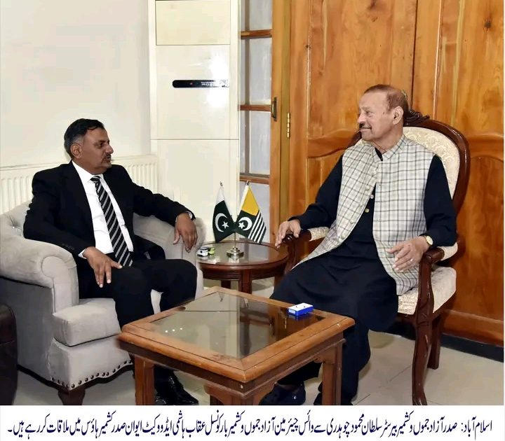 ڈیلی پرل ویو۔صدر آزاد جموں و کشمیر بیرسٹر سلطان محمود چوہدری سے وائس چیئرمین آزاد جموں و کشمیر بار کونسل عقاب ہاشمی ایڈووکیٹ نے ایوانِ صدر، کشمیر ہاؤس اسلام آباد میں تفصیلی ملاقات کی۔