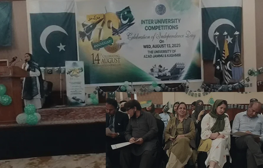 ڈیلی پرل ویو.پاکستان کے جشنِ آزادی کی مناسبت سے آزاد جموں و کشمیر یونیورسٹی کے زیرِاہتمام بین الجامعات انگریزی تقریری مقابلہ مقامی فائیو اسٹار ہوٹل میں منعقد ہوا، جس میں آزاد کشمیر کی تمام جامعات کے طلبہ نے شرکت کی۔