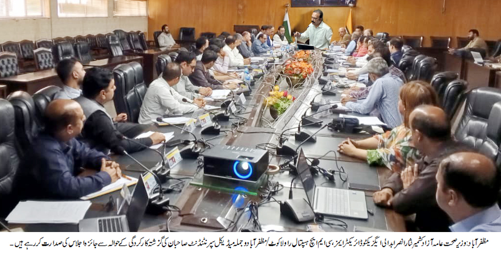 مظفرآباد (ڈیلی پرل ویو) وزیر صحت عامہ آزاد کشمیر نثار انصر ابدالی کی زیر صدارت ایگزیکٹو ڈائریکٹر ایمز، سی ایم ایچ ہسپتال راولاکوٹ و مظفرآباد اور جملہ میڈیکل سپرنٹنڈنٹ صاحبان کا کارکردگی جائزہ اجلاس منعقد ہوا۔