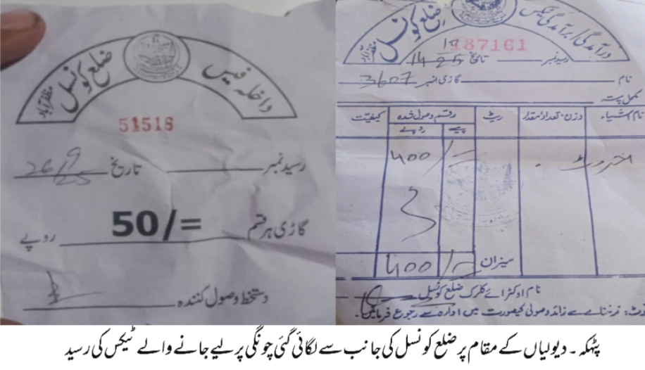 ڈیلی پرل ویو.پٹہکہ،عوام سے ٹیکس وصولی ضلع کونسل نے شاہرائے نیلم دیولیاں کے مقام پر چونگی نصب کر دی ٹرانسپورٹر عوام لٹنے لگے ہر آنے جانے والی گاڑی اور مال مویشی ادھر ادھر لیجانے پر بھاری ٹیکس وصول کیا جانے لگا عوام کو لوٹنے کا نیا طریقہ عوام سراپا احتجاج چیف سیکرٹری آزاد کشمیر ہر دس کلو میٹر پر نصب چونگیوں کو ختم کرتے ہوئے غریب لوگوں کو لٹنے سے بچائیں گزشتہ دو ہفتوں سے نئی نصب ہونے والی چونگی سے ہر آنے جانے والے کو پرچی تھمائی جانے لگی شاہرائے نیلم پر 25 کلو میٹر کے اندر 6 چونگیاں لگا دی گیئں جن میں تین ضلع کونسل کی جبکہ ایک میونسپل کارپوریشن کی اور دو میونسپل کمیٹی پٹہکہ کی عوام ٹیکس دے دے کر تھک گے عوام کو لوٹنے کا نیا طریقہ ایک گھر سے دوسرے گھر میں جانے والے بھی ان چونگیوں پر ٹیکس دیکر جانے لگے عوام نے جا بجا ٹیکسسز کے خلاف احتجاج کا اعلان کر دیا 25 کلو میٹر کے اندر نصب غیر قانونی چونگیوں کو بند کیا جائے و دیگر عوام اور ٹرانسپورٹر اس غیر قانونی ٹیکسسز پر شدید احتجاج کریں گے عوامی حلقوں کے مطابق دیولیاں کے مقام پر ضلع کونسل نے گزشتہ دو ہفتوں سے اپنی چونگی نصب کر دی ہے کوئی بھی شخص پنجکوٹ،نوسدہ،نوسیری،دھنی،بلگراں،کنور،کیلگراں،سرلی سچہ،جھینگ و دیگر ایریا سے اخروٹ یا مال مویشی سمیت گھریلو سامان لائے تو دیولیاں کے مقام پر نصب چونگی پر ان سے بھاری ٹیکس لیا جاتا ہے جس کو بند کیا جائے ٹرانسپورٹر اور عوام ان جا بجا چونگیوں سے تنگ آچکے ہیں پچیس کلو میٹر کے فاصلے میں چھ چونگیوں کا کوئی جواز ہی نہیں بنتا جو غریب عوام کو لوٹنے کا زریعہ ہوں عوام پہلے ہی مہنگائی کی چکی میں پس رہی ہے مزید بوجھ تلے نہ دبایا جائے ذرائع کے مطابق اجنبی سیاحوں سے بھی ان مقامات پر ٹیکس لیا جاتا ہے جو کہ سرا سر نا انصافی ہے وزیر اعظم آزاد کشمیر،چیف سیکرٹری،کمشنر مظفرآباد،ڈپٹی کمشنر شاہرائے نیلم پر ضلع کونسل کی جانب سے لگائی جانے والی چونگیوں کو ختم کریں و دیگر عوام اس پر شدید احتجاج کریں گے ،،