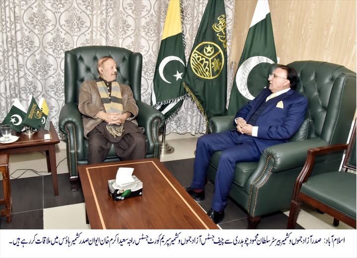 ڈیلی پرل ویو.صدر آزادجموں و کشمیربیرسٹر سلطان محمودچوہدری سے چیف جسٹس آزادجموں وکشمیر سپریم کورٹ جسٹس راجہ سعید اکرم خان کی ایوان صدر کشمیر ہاؤس اسلام آباد میں تفصیلی ملاقات۔ اس موقع پر صدر آزادجموں وکشمیربیرسٹر سلطان محمود چوہدری اور چیف جسٹس آزادجموں وکشمیر سپریم کورٹ جسٹس راجہ سعید اکرم خان کے درمیان آزادجموں وکشمیر سپریم کورٹ میں جج کی خالی آسامی پر مشاورت کی گئی۔ اس موقع پر چیف جسٹس آزادجموں وکشمیر سپریم کورٹ جسٹس راجہ سعید اکرم خان نے صدر آزادجموں وکشمیر بیرسٹر سلطان محمود چوہدری کو مظفرآباد میں گزشتہ دنوں منعقد ہونے والی جوڈیشل کانفرنس کے حوالے سے تفصیلی بریفنگ دی جس پر صدر ریاست آزادجموں وکشمیر بیرسٹر سلطان محمود چوہدری نے چیف جسٹس سپریم کورٹ راجہ سعید اکرم خان کو جوڈیشل کانفرنس کے کامیاب انعقاد پر مبارکباد دیتے ہوئے کہا کہ جوڈیشل کانفرنس کا آزادکشمیر میں انعقاد ایک بہت بڑی کامیابی ہے اور اس میں چیف جسٹس آف پاکستان یحییٰ آفریدی کی شرکت ایک مثبت اور خوش آئند ہے اور اس کے دوررس اثرات مرتب ہونگے اور اس سے پاکستان اور آزادکشمیر کے مثالی تعلقات کو بھی مزید تقویت ملے گی۔اس موقع پر صدر آزادجموں وکشمیر بیرسٹر سلطان محمود چوہدری اور چیف جسٹس سپریم کورٹ آزادجموں وکشمیر راجہ سعید اکرم خان کے درمیان باہمی دلچسپی سمیت دیگر امور پر بھی تبادلہ خیال کیا۔