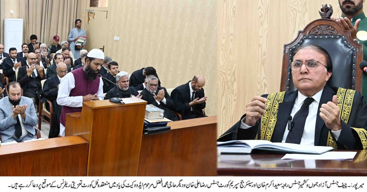 ڈیلی پرل ویو.چیف جسٹس آزاد جموں وکشمیر جسٹس راجہ سعید اکرم خان کی سربراہی میں سینئرقانون دان حاجی محمد افضل مرحوم کی یاد میں فل کورٹ تعزیتی ریفرنس سپریم کورٹ رجسٹری برانچ میرپور میں منعقد ہو ا۔تعزیتی ریفرنس میں جج سپریم کورٹ جسٹس رضا علی خان سمیت سپریم کورٹ،ہائی کورٹ اور ڈسٹرکٹ بار ایسوسی ایشن کے سینئر وکلاء بھی موجود تھے جبکہ اس موقع پر ڈپٹی رجسٹرار سپریم کورٹ افتخارشوکت نے نظامت کے فرائض سرانجام دیے۔تعزیتی ریفرنس سے چیف جسٹس آزادجموں وکشمیر جسٹس راجہ سعید اکرم خان، آزادکشمیر کے ایڈووکیٹ جنرل شیخ مسعود اقبال، وائس چیئرمین بار کونسل چوہدری طارق بشیرایڈووکیٹ، سیکرٹری جنرل سپریم کورٹ بار ایسوسی ایشن چوہدری راشد رشید ایڈووکیٹ،صدر ہائی کورٹ بار ایسوسی ایشن راجہ وسیم یونس ایڈووکیٹ،جنرل سیکرٹری ڈسٹرکٹ بار ایسوسی ایشن چوہدری فیاض ایڈووکیٹ،چوہدری لیاقت افضل ایڈووکیٹ نے خطاب کیا جبکہ اس موقع پر سابق ایڈووکیٹ جنرل مسعود اے شیخ،سابق صدر سپریم کورٹ بار ایسوسی ایشن جاوید نجم الثاقب ایڈووکیٹ،سابق صدر ہائی کورٹ بار ایسوسی ایشن بابر اعظم ایڈووکیٹ،کامران طارق ایڈووکیٹ،انفارمیشن آفیسر محمد جاوید ملک کے علاوہ سینئر وکلاء بھی موجود تھے۔