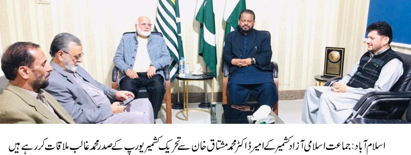 اسلام آباد(ڈیلی پرل ویو)جماعت اسلامی آزاد کشمیرگلگت بلتستان کے امیر ڈاکٹرمحمد مشتاق خان نے کہاہے کہ اوورسیز کشمیری مسئلہ کشمیرکے حقیقی سفیر اور ہماراسرمایہ ہیں،تحریک کشمیربرطانیہ اور تحریک کشمیر یورپ نے مسئلہ کشمیرکس سفارتی محاذپر بھرپورا نداز سے اٹھایا،مودی کی فسطائیت کو مزید عالمی سطح پر اجاگر کرنے کی ضرورت ہے،کشمیریوں نے آزادی یاشہادت کا فیصلہ کیاہواہے،عالمی برادری پر فرض ہے کہ وہ اپنے عہد کے مطابق کشمیریوں کو حق خودارادیت دلائے،ان خیالات کااظہارانھوں نے تحریک کشمیریورپ کے صد ر محمد غالب سے گفتگوکرتے ہوئے کیا محمد غالب مرکز جماعت اسلامی تشریف لائے،اس موقع پر سیکرٹری جنرل جماعت اسلامی راجہ جہانگیر خان بھی موجود تھے،تحریک کشمیریورپ کے صد رمحمد غالب نے یورپ میں مسئلہ کشمیرکو اجاگرکرنے کے حوالے بریف کیا،اس موقع پر ڈاکٹر محمد مشتا ق خا ن نے کہاکہ لاکھوں کشمیری شہداء کا خون رائیگاں نہیں جائے گا کشمیرآزادہوگا،انھوں نے کہاکہ ہندوستان کی قیادت نے خود اقوام متحدہ میں جاکر عالمی برادری کے سامنے عہد کیاتھاکہ وہ کشمیریوں کو ان کوحق دے گا تاکہ کشمیر ی اپنی آزاد مرضی سے اپنے سیاسی مستقبل کافیصلہ کریں،ہندوستان اگر عہد شکنی کررہاہے تو عالمی برادری کی ذمہ داری ہے کہ وہ ہندوستان کے خلا ف کارروائی کرے۔