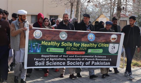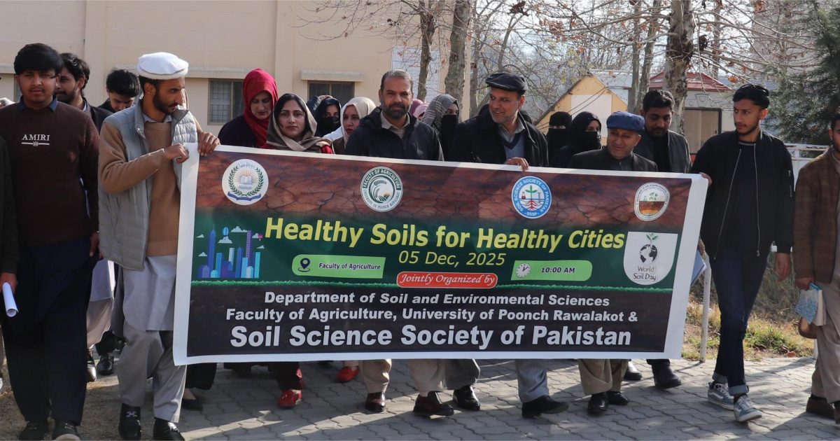 راولاکوٹ(ڈیلی پرل ویو)جامعہ پونچھ راولا کوٹ کی فیکلٹی آف ایگریکلچر کے شعبہ سوئل اینڈ انوائرمنٹل سائنسز کے زیراہتمام اور سوائل سائنسز سوسائٹی آف پاکستان کے تعاون سے ورلڈ سوئل ڈے 2025 کے موقع پر آگاہی واک اور خصوصی تقریب کا انعقاد کیا گیااور کیک کاٹا گیا۔رواں سال مٹی کا عالمی دن (صحت مند مٹی، صحت مند شہر) کی تھیم کے تحت منایا جا رہا ہے۔ جس کا مقصد شہری علاقوں میں مٹی کی اہمیت کو اجاگر کرنا ہے۔اس موقع پر اظہار خیال کرتے ہو ئے رجسٹرار و ڈین ایگریکلچر پروفیسر ڈاکٹر امتیاز حسین نے کہا کہ کہا کہ سڑکوں، عمارتوں اور اسفالٹ کے نیچے موجود مٹی اگر قابل نفوذ ہو اور اس پر سبزہ موجود ہو تو یہ بارش کے پانی کو جذب کرتی ہے، درجہ حرارت کو متوازن رکھتی ہے، کاربن محفوظ کرتی ہے اور ہوا کے معیار کو بہتر بناتی ہے۔یوں شہروں کو زیادہ صحت مند بنانے میں مدد دیتی ہے۔انھوں نے نے طلبہ پر زور دیا کہ وہ آج کے دن کے پیغام کو سمجھیں اور اسے عام کریں۔تقریب میں پروفیسر ڈاکٹر ناصر رحیم, پروفیسر ڈاکٹر شاہد اقبال اعوان۔چیئر پرسن شعبہ سوائل اینڈ انوائر نمنٹل سائنسز ڈاکٹر عقیلہ شاہین سمیت اساتذہ اور طلبہ کی بڑی تعداد نے شرکت کی۔خطاب کرتے ہوئے مقررین نے کہا کہ مٹی قدرت کا قیمتی اثاثہ ہے جس کی حفاظت اور زرخیزی کا برقرار رہنا مستقبل کی زرعی پیداوار اور ماحولیات کے تحفظ کے لئے نہایت اہم ہے۔ انہوں نے نوجوان محققین پر زور دیا کہ وہ تحقیقی بنیادوں پر حل تلاش کریں اور شہری علاقوں میں مٹی کے تحفظ کے حوالے سے شعور بیدار کریں۔دریں اثناء آگاہی واک میں