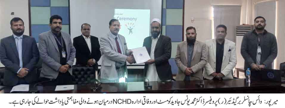 ڈیلی پرل ویو،وزیراعظم پاکستان میاں شہباز شریف،وفاقی وزیر تعلیم اینڈ پروفیشنل ٹرینگ، وفاقی سیکرٹری تعلیم اور ڈاریکٹر جنرل این سی ایچ ڈی کی ہدایات پر این سی ایچ ڈی اور میرپور یونیورسٹی آف سائنس اینڈ ٹیکنالوجی کے مابین مفاہمتی یاداشت پر دستخط۔ ضلع میرپور میں خواندگی کی شرح کو بہتر سے بہتر بنانے کے لیے وفاقی ادارہ NCHDاور میرپور یونیورسٹی آف سائنس اینڈ ٹیکنالوجی کے مابین پروگرام Each one Teach one کے سلسلہ میں مفاہمتی یاداشت پر دستخط کیے گے۔ معاہدہ سے ضلع میرپور میں خواندگی کی شرح میں اضافہ کرنے میں مدد ملے گی میرپور یونیورسٹی آف سائنس اینڈ ٹیکنالوجی میں منعقدہ تقریب میں ڈپٹی ڈاریکٹر NCHD کوٹلی شاہد رشیدنے شرکا ء تقریب کو پروگرام کے حوالے سے تفصیلی بریفنگ دی۔تقریب میں میرپور یونیورسٹی آف سائنس اینڈ ٹیکنالوجی کے آفیسران اور ذمہ داران نے شرکت کی،۔ انہوں نے شرکاء کو وزیر اعظم پاکستان کے روشن پاکستان انشی ایٹیو اور 2024 سے جاری قومی تعلیمی ایمرجنسی کے خدو خال سے آگاہ کیا۔ تقریب سے اسسٹنٹ ڈائریکٹر میر پورشاہد رفیق قریشی اور اسسٹنٹ ڈاریکٹر ضلع بھمبر راجہ ماجد ضیاء نے بھی خطاب کیا۔ بریفنگ میں NCHD کے دائرہ کار، خواندگی کے پروگرامز، کمیونٹی فیڈر سکولز اور مدارس کی رجسٹریشن پر روشنی ڈالی گئی۔Mou کے بنیادی نکات کے مطابق میرپور یونیورسٹی آف سائینس اینڈ ٹیکنالوجی کے عام طلبہ وطالبات اپنے اپنے علاقوں میں موجود ایک ناخواندہ فرد کو NCHD کے فراہم کردہ سلیبس کی مدد سے خواندہ کرنے کے پابند ہوں گے۔اس اقدام کا مقصد نوجوانوں کو سماجی خدمت سے جوڑتے ہوئے حقیقی معنوں میں کمیونٹی لیول پر خواندگی میں اضافہ کرنا ہے۔ تقریب میں میرپور یونیورسٹی آف سائنس اینڈ ٹیکنالوجی آف کے وائس چانسلر برگیڈئیر(ر) پروفیسر ڈاکٹر محمد یونس جاوید، ڈپٹی رجسٹرار محمد نوید، سینئر پی اے داؤد صدیقی،پبلک ریلیشنز آفیسرمحمد حفیظ،اسسٹنٹ ڈاریکٹر بھمبرراجہ ماجد ضیاء اور مختلف شعبہ جات کے نمائندگان بھی شامل تھے۔مفاہمتی یاداشت پر دستخط وفاقی ادارہ NCHD کی جانب سے شاہد رشید ڈپٹی ڈاریکٹر کوٹلی اور شاہد رفیق قریشی اسسٹنٹ ڈاریکٹر میرپور جبکہ میرپور یونیورسٹی آف سائنس اینڈ ٹیکنالوجی کی جانب سے وائس چانسلر برگیڈئیر (ر) پروفیسر ڈاکٹر محمد یونس جاوید اور پروفیسر ڈاکٹر خرم پرویز امبر QEC نے دستخط کیے۔اس موقع پر مقررین نے کہا کہ یہ شراکت داری قومی سطح پر جاری، خواندگی مہم کو مزید مضبوط کرے گی اور طلبہ میں خدمت خلق، ذمہ داری اور سماجی فلاح کے جذبے کو فروغ دے گی۔