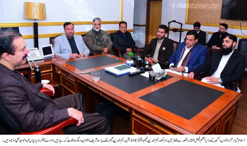 ڈیلی پرل ویو،آزاد جموں و کشمیر کے وزیراعظم فیصل ممتاز راٹھور سے چیئرمین رمرسکو و رحیم الدین نعیم ویلفیئر فاؤنڈیشن رحیم الدین نعیم، قانون ساز اسمبلی کے امیدوار حلقہ بلوچ ملک باسط شریف اعوان،سید اشفاق بخآری اور سعید عباسی نے ملاقات کی۔ ملاقات میں موسٹ سینئر وزیر میاں عبد الوحید اور سابق مشیر سردار امجد یوسف بھی موجود تھے۔ملاقات کے دوران عوامی فلاح و بہبود کے بڑے منصوبوں پر تفصیلی تبادلہ خیال کیا گیا۔ ان منصوبوں میں 500 بیڈ پر مشتمل جدید ہسپتال کو عوام کے لیے وقف کرنے، ایک میڈیکل کالج کے قیام اور 200 گھروں پر مشتمل ہاؤسنگ منصوبہ شامل ہے، جن میں سے 100 گھر مکمل ہو چکے ہیں۔ وفد نے وزیراعظم کو آگاہ کیا کہ مکمل ہونے والے گھروں کی چابیاں وزیراعظم آزاد جموں و کشمیر خود اپنے دستِ مبارک سے مستحق خاندانوں کے حوالے کریں گے جبکہ جدید ہسپتال اور میڈیکل کالج کا سنگِ بنیاد بھی وزیراعظم رکھیں گے۔اس موقع پر گفتگو کرتے ہوئے وزیراعظم فیصل ممتاز راٹھور نے کہا کہ آزاد جموں و کشمیر کی حکومت عوامی فلاح کے منصوبوں کو اولین ترجیح دے رہی ہے۔ انہوں نے کہا کہ صحت اور تعلیم کے شعبوں میں سرمایہ کاری دراصل قوم کے محفوظ مستقبل میں سرمایہ کاری ہے۔ 500 بیڈ کے جدید ہسپتال اور میڈیکل کالج کے قیام سے نہ صرف معیاری طبی سہولیات میسر آئیں گی بلکہ مقامی نوجوانوں کے لیے اعلیٰ تعلیم اور روزگار کے نئے مواقع بھی پیدا ہوں گے۔وزیراعظم نے کہا کہ ہاؤسنگ منصوبے کے تحت مستحق خاندانوں کو باعزت رہائش کی فراہمی حکومت کی سماجی ذمہ داری ہے اور اس سلسلے میں شفافیت اور میرٹ کو ہر صورت یقینی بنایا جائے گا۔ انہوں نے فلاحی اداروں کے کردار کو سراہتے ہوئے کہا کہ حکومت اور نجی شعبے کے باہمی اشتراک سے عوامی مسائل کے پائیدار حل ممکن ہیں۔وزیراعظم فیصل ممتاز راٹھور نے وفد کو یقین دلایا کہ حکومت تمام عوامی فلاحی منصوبوں کی بروقت تکمیل کے لیے بھرپور تعاون فراہم کرے گی اور خود ان منصوبوں کی نگرانی بھی کریں گے تاکہ عام آدمی کو ان کے ثمرات جلد از جلد میسر آ سکیں۔