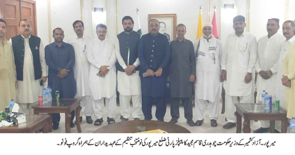 ڈیلی پرل ویو.آزاد کشمیر کے وزیر امورمنگلا ڈیم و منگلا ڈیم ہاؤسنگ اتھارٹی چوہدری قاسم مجید کی پیپلز پارٹی ضلع میرپور کی نو منتخب تنظیم کے عہدیداران سے پیپلز سیکٹریٹ (کھنڈا موڑ) چکسواری میں ملاقات۔انہوں نے ضلعی تنظیم کے عہدیداران کو پارٹی کی جانب سے تفویض ہونے والی نئی ذمہ داریوں پر مبارکباد دیتے ہوئے اس یقین کا اظہار کیا کہ تمام عہدیداران اپنی شبانہ روز محنت سے پارٹی کی مضبوطی کے لیے کام کریں۔انہوں نے حلقہ 2 چکسواری اور آزاد کشمیر بھر میں پارٹی کے ورکرز کو مخاطب کرتے ہوئے درخواست کی کہ پارٹی میں نئے شامل ہونے والے لوگوں کو اپنے جمہوری رویہ سے ثابت کریں کہ پارٹی کا ہر کارکن و عہدیدار ان کے تمام جمہوری اور جائز حقوق میں ان کا ساتھی ہے۔انہوں نے اپنے خیالات کا اظہار کرتے ہوئے کہا کہ آنے والا الیکشن پیپلز پارٹی بھاری مارجن سے جیتے گی اور آزاد خطہ میں حکومت بنائے گی اور ماضی کی طرح پسے ہوئے طبقات کا معیار زندگی بہتر بنائے گی۔ضلعی تنظیم کے عہدیداران کی جانب سے چوہدری قاسم مجید کو حلقہ 2 چکسواری کی تعمیر و ترقی میں بھرپور کردار ادا کرنے اور پارٹی میں نئے لوگوں کو شامل کر کے حلقہ 2 کے اندر پارٹی کا مزید مضبوط کرنے پر خراج تحسین پیش کیاگیا۔